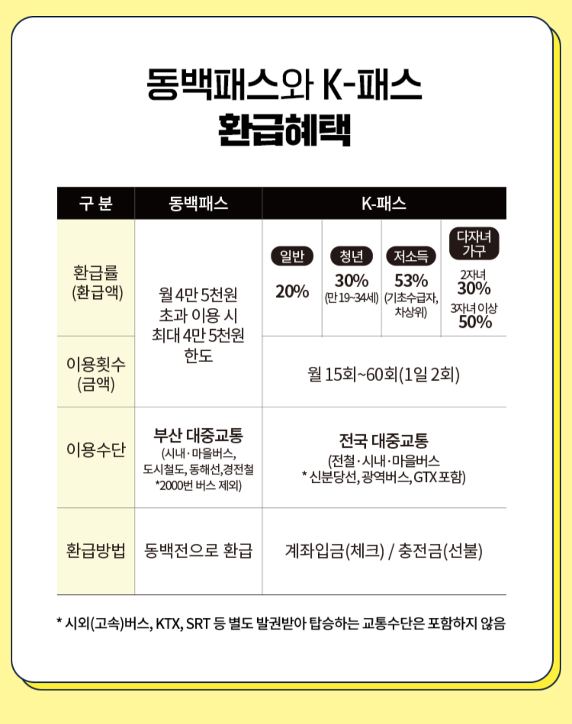 하지만!부산시의 동백패스는 연령 제한 없이 누구나 사용할 수 있고, 환급률은 무려 50%, 최대 3만 원까지 받을 수 있다는 점에서 훨씬 유리합니다.